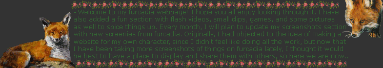 -Update (1/20/06): Phew.. It sure has been a long time since I had last updated this website.. Quite a bit has happened in fact since I was last able to add stuff to this website. Infact, I had decided to quit Furcadia for a few months because I was growing bored of the game. Not to mention, my description webpage should not even say that I am currently mated to Kallyna, since we both broke up like more than 2 months ago.. Anyhow.. I never really posted this on the news page, but most of the fun section had already been completed before I left furcadia for awhile. I went to play other games where I felt I was being missed the most, but now I am back again due to that homesick feeling you get when you're away from something for way too long with so many of those great memories you had cherished.. On a final note, the screenshots page and links page should be updated within time now, so for any of my friends out there who happen to know about this website that's still under development, I suggest to you that you should check them out when you get the chance ;)