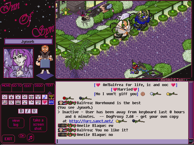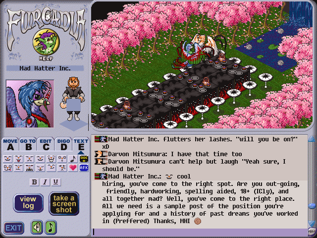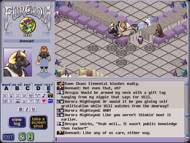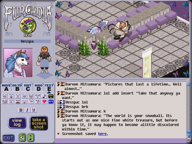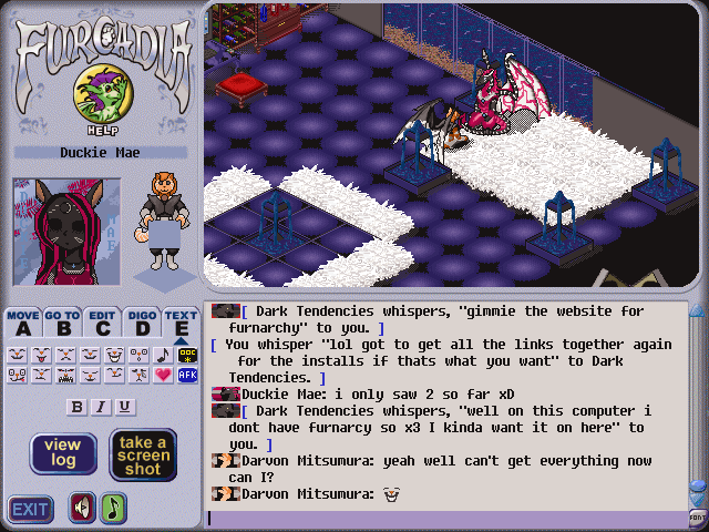 A long while back, I had made a promise to check out this girl's dream while Kally and I had been adding changes to the original Firewall dream to see if we couldn't improve its overall look. It so turns out that a few months later on, I had encountered the dream while roaming around FurN, and decided to drop by and say hello. It's pretty funny how we look in the screenshot I took. Almost like we were about to kiss. Too cute.. hehe.
