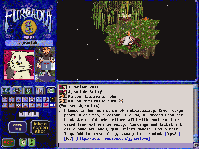 I remember when I had gotten bored at the Emerald Springs that I ended up giving furres tours of my dream to see what they thought of it. Doesn't Jyramiah look so adorable on that swing? =P